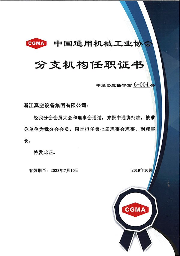 • 中國通用機械工業協會分支機構任職證書